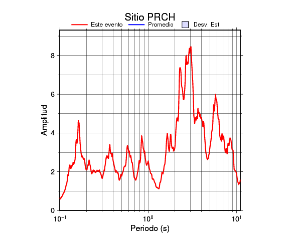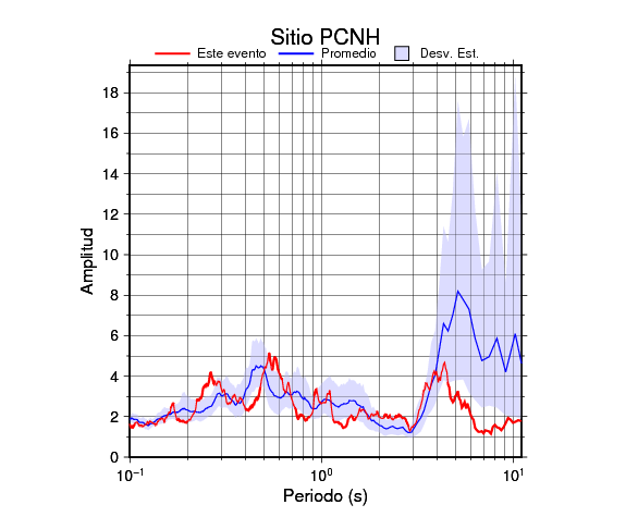 Los resultados que se presentan aquí fueron obtenidos luego de dividir las componentes horizontales entre la componente vertical (conocido como técnica H/V). Se grafica tanto el efecto de sitio del sismo registrado como el valor promedio en cada estación y su correspondiente desviación estándar.