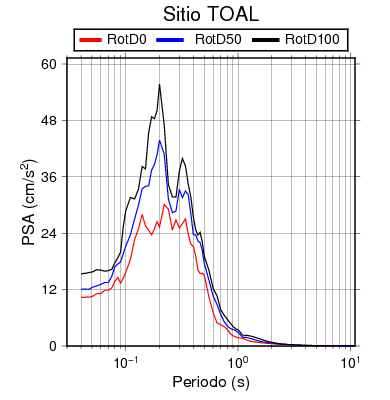 RotD50 representa un valor medio de la respuesta por lo cual se puede comparar con valores de otras medidas empleadas en modelos de atenuación como la Media Geométrica de las componentes ortogonales (GM). RotD0 y RotD100 son los valores extremos (mínimo y máximo), los cuales nos pueden servir para determinar la dispersión de la posible respuesta en cada sitio.