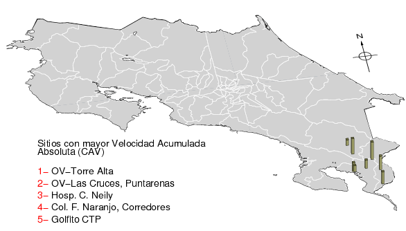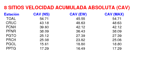 La velocidad acumulada absoluta (CAV por sus siglas en inglés) es otro parámetro que se usa para caracterizar el movimiento fuerte del suelo. Los datos están dados en cm/s para las componentes norte-sur (NS) y este-oeste (EW). El máximo de ambas se da en la tercera columna.