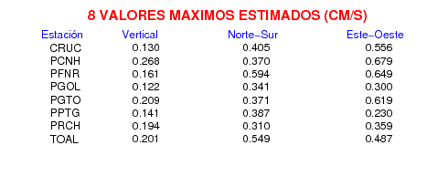 Los registros de velocidad se obtienen de la integración de los datos de aceleración. Esta tabla contiene los valores de velocidad máxima (PGV por sus siglas en inglés) para cada componente en cm/s. Las estaciones se listan en orden alfabético y corresponden a los sitios en que el nivel de aceleración fue superior a los 5 cm/s2.