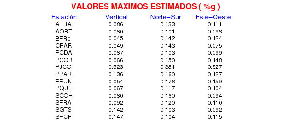 La siguiente tabla muestra los datos de aceleración máxima para cada componente en porcentaje de la aceleración de la gravedad (%g). Estos se obtienen dividiendo el valor del PGA registrado por 980 cm/s2 y multiplicándolo por 100.