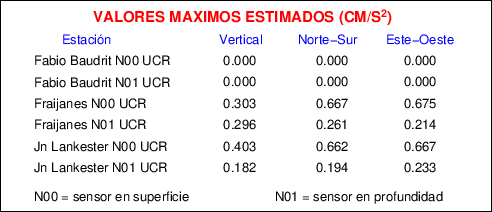 Aquí se muestran las formas de onda y cocientes espectrales de los sensores colocados en pozo . Uno se ubica en el Jardín Lankester en Paraíso de Cartago con 30 m de profundidad y el otro en la Estación Experimental Fabio Baudrit en Alajuela con 40 m de profundidad. La tabla muestra los valores de aceleración máxima (PGA) leídos de las tres componentes en superficie (N00) y en profundidad (N01)