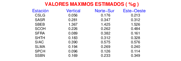 La siguiente tabla muestra los datos de aceleración máxima para cada componente en porcentaje de la aceleración de la gravedad (%g). Estos se obtienen dividiendo el valor del PGA registrado por 980 cm/s2 y multiplicándolo por 100.