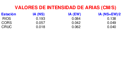 En esta sección se muestra el cáculo de la IA para la componente norte-sur (NS) y este-oeste (EW) de los registros de aceleración que tuvieron valores superiores a los 5 cm/s2, así como el valor total de esta que corresponde al promedio de ambas componentes horizontales.