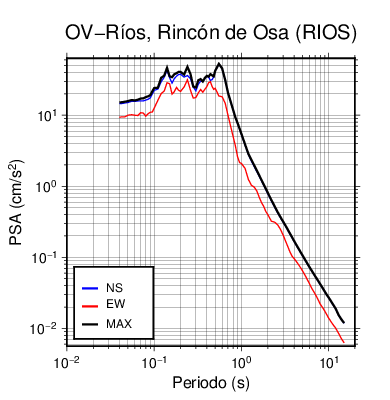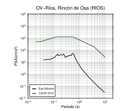 En los siguientes gráficos, la traza verde es el espectro propuesto por el CSCR-2010, la traza negra es el espectro máximo de este sismo. El valor de la amplitud está dado en pseudoaceleración en cm/s2.