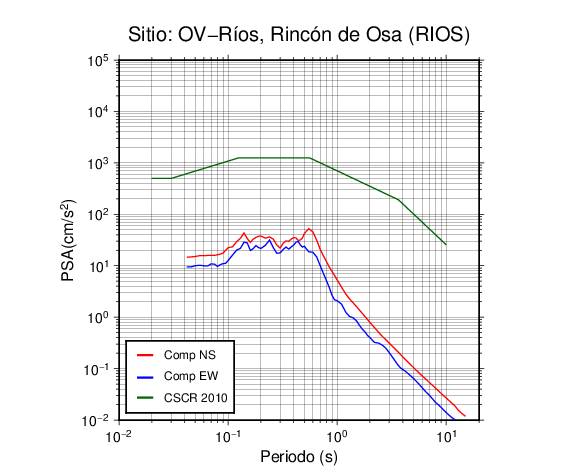 En los siguientes gráficos, la traza verde es el espectro propuesto por el CSCR-2010, la traza roja es el espectro de este sismo en la componente norte-sur (NS) y la traza azul la componente este-oeste (EW). El valor de la amplitud está dado en pseudoaceleración en cm/s2.