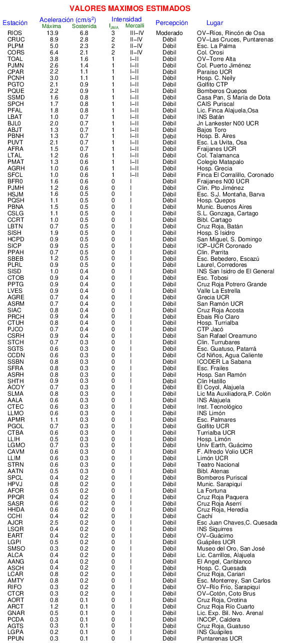 La siguiente tabla muestra los valores de Aceleración Máxima o aceleración pico (PGA por sus siglas en inglés). Este es el valor máximo en cualquiera de las 3 componentes del registro.