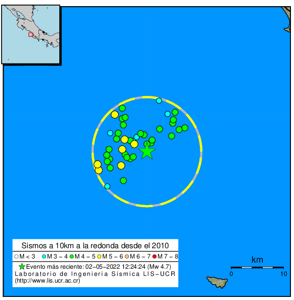 A 10km a la redonda del epicentro, el LISUCR ha localizado también los siguientes sismos ocurridos desde el 2010. Todos ellos con profundidades inferiores a los 40km.