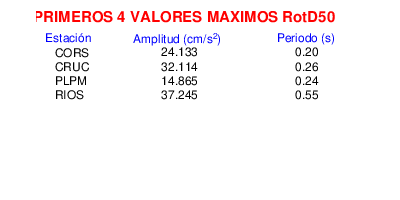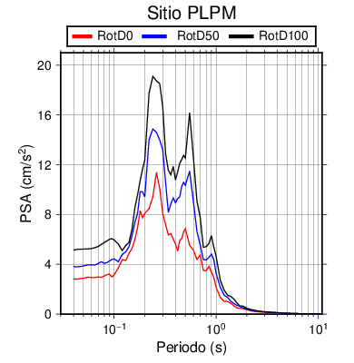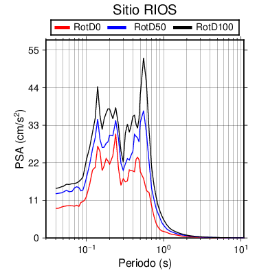 RotD50 representa un valor medio de la respuesta por lo cual se puede comparar con valores de otras medidas empleadas en modelos de atenuación como la Media Geométrica de las componentes ortogonales (GM). RotD0 y RotD100 son los valores extremos (mínimo y máximo), los cuales nos pueden servir para determinar la dispersión de la posible respuesta en cada sitio.