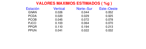 La siguiente tabla muestra los datos de aceleración máxima para cada componente en porcentaje de la aceleración de la gravedad (%g). Estos se obtienen dividiendo el valor del PGA registrado por 980 cm/s2 y multiplicándolo por 100.