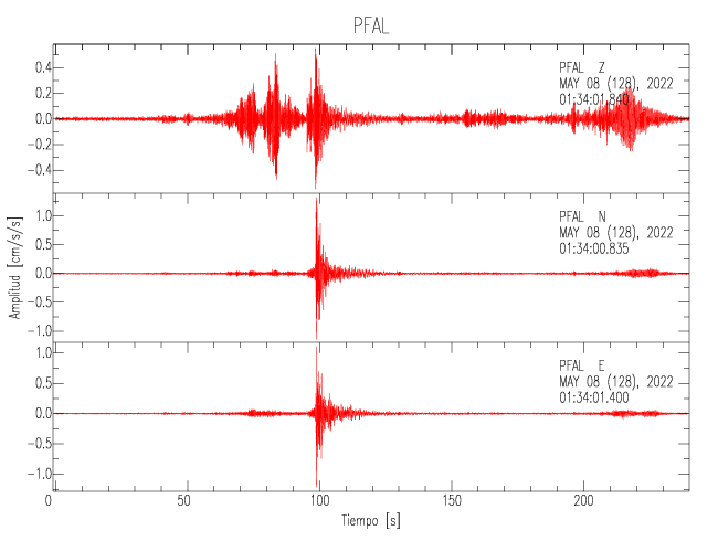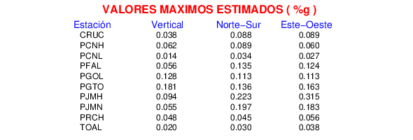 La siguiente tabla muestra los datos de aceleración máxima para cada componente en porcentaje de la aceleración de la gravedad (%g). Estos se obtienen dividiendo el valor del PGA registrado por 980 cm/s2 y multiplicándolo por 100.