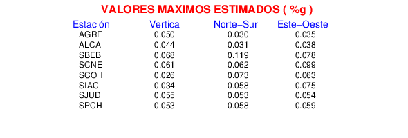 La siguiente tabla muestra los datos de aceleración máxima para cada componente en porcentaje de la aceleración de la gravedad (%g). Estos se obtienen dividiendo el valor del PGA registrado por 980 cm/s2 y multiplicándolo por 100.