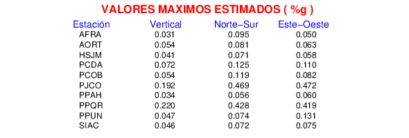 La siguiente tabla muestra los datos de aceleración máxima para cada componente en porcentaje de la aceleración de la gravedad (%g). Estos se obtienen dividiendo el valor del PGA registrado por 980 cm/s2 y multiplicándolo por 100.