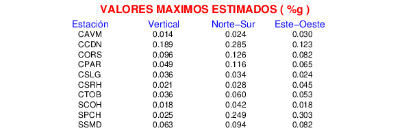 La siguiente tabla muestra los datos de aceleración máxima para cada componente en porcentaje de la aceleración de la gravedad (%g). Estos se obtienen dividiendo el valor del PGA registrado por 980 cm/s2 y multiplicándolo por 100.
