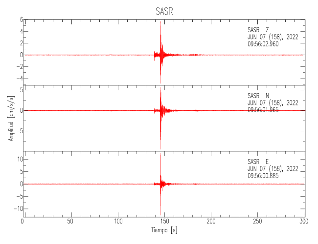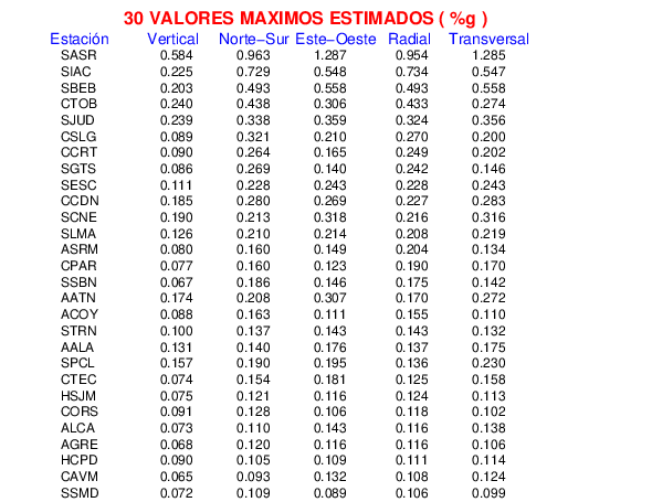 La siguiente tabla muestra los datos de aceleración máxima para cada componente en porcentaje de la aceleración de la gravedad (%g). Estos se obtienen dividiendo el valor del PGA registrado por 980 cm/s2 y multiplicándolo por 100. Los valores de las últimas dos columnas corresponden a la componente radial y transversal. Los datos se listan en orden descendente según el valor de la componente radial.