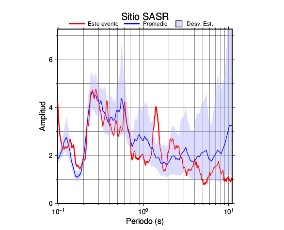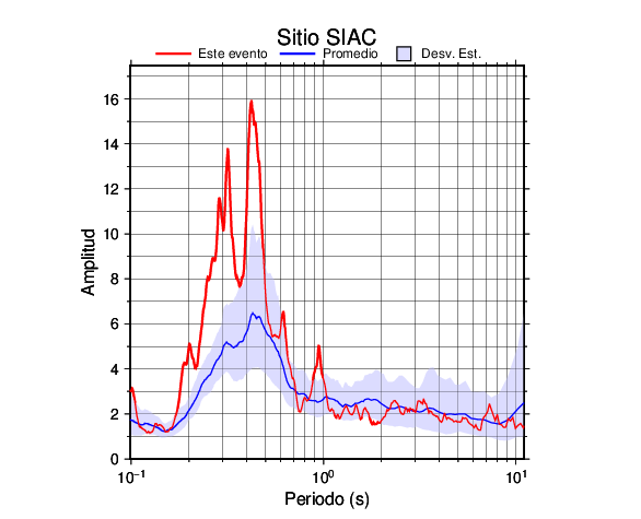 Los resultados que se presentan aquí fueron obtenidos luego de dividir las componentes horizontales entre la componente vertical (conocido como técnica H/V). Se grafica tanto el efecto de sitio del sismo registrado como el valor promedio en cada estación y su correspondiente desviación estándar.