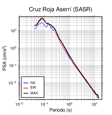 En los siguientes gráficos, la traza verde es el espectro propuesto por el CSCR-2010, la traza negra es el espectro máximo de este sismo. El valor de la amplitud está dado en pseudoaceleración en cm/s2.