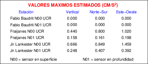 Aquí se muestran las formas de onda y cocientes espectrales de los sensores colocados en pozo . Uno se ubica en el Jardín Lankester en Paraíso de Cartago con 30 m de profundidad y el otro en la Estación Experimental Fabio Baudrit en Alajuela con 40 m de profundidad. La tabla muestra los valores de aceleración máxima (PGA) leídos de las tres componentes en superficie (N00) y en profundidad (N01)