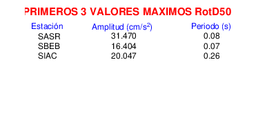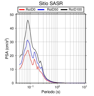 RotD50 representa un valor medio de la respuesta por lo cual se puede comparar con valores de otras medidas empleadas en modelos de atenuación como la Media Geométrica de las componentes ortogonales (GM). RotD0 y RotD100 son los valores extremos (mínimo y máximo), los cuales nos pueden servir para determinar la dispersión de la posible respuesta en cada sitio.