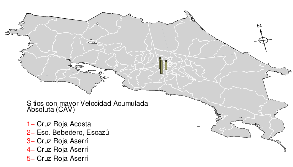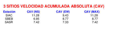 La velocidad acumulada absoluta (CAV por sus siglas en inglés) es otro parámetro que se usa para caracterizar el movimiento fuerte del suelo. Los datos están dados en cm/s para las componentes norte-sur (NS) y este-oeste (EW). El máximo de ambas se da en la tercera columna.