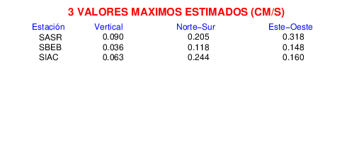 Los registros de velocidad se obtienen de la integración de los datos de aceleración. Esta tabla contiene los valores de velocidad máxima (PGV por sus siglas en inglés) para cada componente en cm/s. Las estaciones se listan en orden alfabético y corresponden a los sitios en que el nivel de aceleración fue superior a los 5 cm/s2.