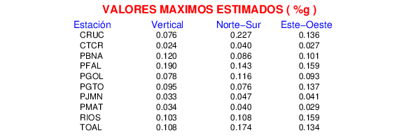 La siguiente tabla muestra los datos de aceleración máxima para cada componente en porcentaje de la aceleración de la gravedad (%g). Estos se obtienen dividiendo el valor del PGA registrado por 980 cm/s2 y multiplicándolo por 100.