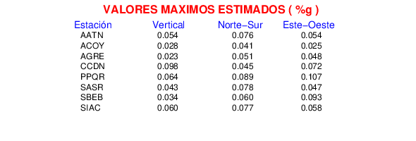 La siguiente tabla muestra los datos de aceleración máxima para cada componente en porcentaje de la aceleración de la gravedad (%g). Estos se obtienen dividiendo el valor del PGA registrado por 980 cm/s2 y multiplicándolo por 100.