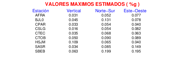 La siguiente tabla muestra los datos de aceleración máxima para cada componente en porcentaje de la aceleración de la gravedad (%g). Estos se obtienen dividiendo el valor del PGA registrado por 980 cm/s2 y multiplicándolo por 100.