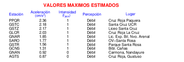 Intensidades en sitios de registro.Cada uno de los cuadrados en el mapa corresponde a la ubicación de un acelerógrafo al momento del sismo. Estos se muestran en distintos colores según la escala mostrada al pie de la figura.