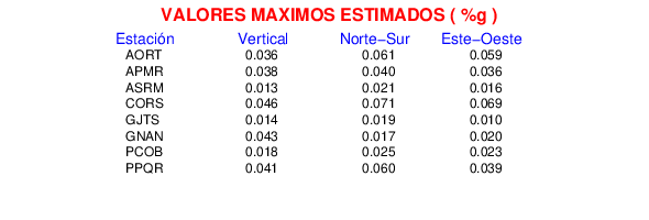 La siguiente tabla muestra los datos de aceleración máxima para cada componente en porcentaje de la aceleración de la gravedad (%g). Estos se obtienen dividiendo el valor del PGA registrado por 980 cm/s2 y multiplicándolo por 100.