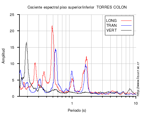También se muestra el cociente espectral (en el rango de 0.1 a 10 s) entre el nivel superior (sea el último piso o la azotea) e inferior (sea el primero piso o el sótano) para cada una de las componentes LONG=longitudinal, TRAN=transversal y VERT=vertical. En los casos en que el nivel superior o inferior no estén disponibles al momento del sismo, se muestra una imagen con la leyenda "No se pudo calcular".
