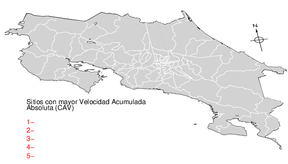 La velocidad acumulada absoluta (CAV por sus siglas en inglés) es otro parámetro que se usa para caracterizar el movimiento fuerte del suelo. Los datos están dados en cm/s para las componentes norte-sur (NS) y este-oeste (EW). El máximo de ambas se da en la tercera columna.