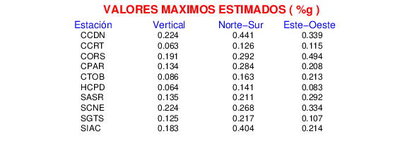 La siguiente tabla muestra los datos de aceleración máxima para cada componente en porcentaje de la aceleración de la gravedad (%g). Estos se obtienen dividiendo el valor del PGA registrado por 980 cm/s2 y multiplicándolo por 100.