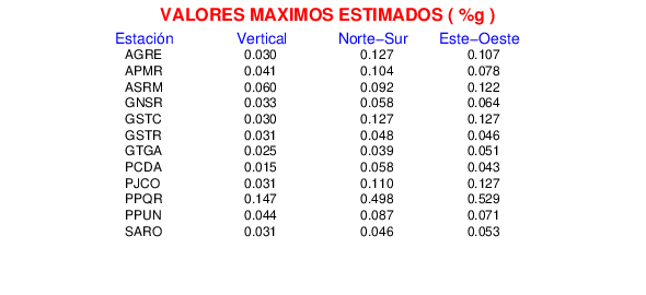 La siguiente tabla muestra los datos de aceleración máxima para cada componente en porcentaje de la aceleración de la gravedad (%g). Estos se obtienen dividiendo el valor del PGA registrado por 980 cm/s2 y multiplicándolo por 100.
