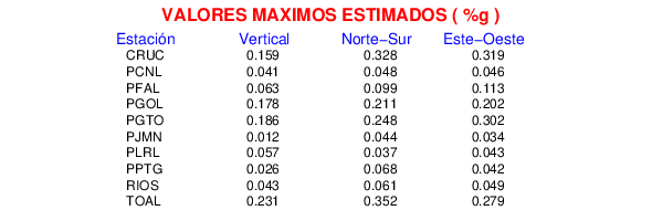 La siguiente tabla muestra los datos de aceleración máxima para cada componente en porcentaje de la aceleración de la gravedad (%g). Estos se obtienen dividiendo el valor del PGA registrado por 980 cm/s2 y multiplicándolo por 100.
