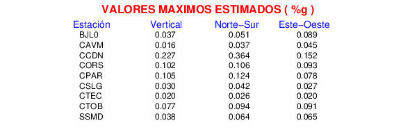 La siguiente tabla muestra los datos de aceleración máxima para cada componente en porcentaje de la aceleración de la gravedad (%g). Estos se obtienen dividiendo el valor del PGA registrado por 980 cm/s2 y multiplicándolo por 100.