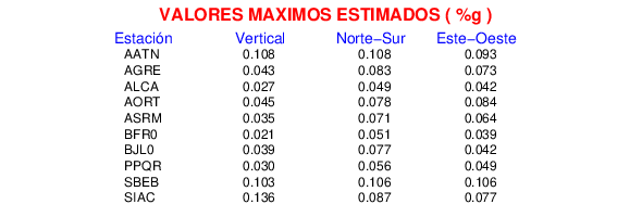 La siguiente tabla muestra los datos de aceleración máxima para cada componente en porcentaje de la aceleración de la gravedad (%g). Estos se obtienen dividiendo el valor del PGA registrado por 980 cm/s2 y multiplicándolo por 100.