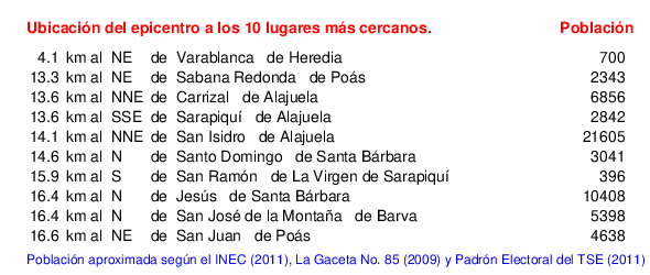 Mapa de la zona epicentral. Se muestran las poblaciones más cercanas al epicentro y fallas activas. Abajo están las distancias que hay del epicentro a cada uno de los diez sitios más cercanos y la cantidad de habitantes que poseen.