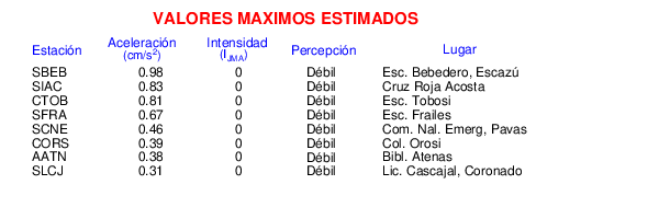 Intensidades en sitios de registro.Cada uno de los cuadrados en el mapa corresponde a la ubicación de un acelerógrafo al momento del sismo. Estos se muestran en distintos colores según la escala mostrada al pie de la figura.