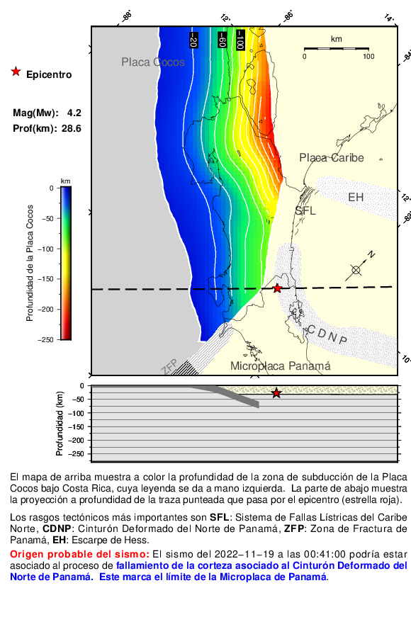 Origen del sismo: Este mapa muestra el marco tectónico de Costa Rica. El mapa se ha rotado para que el corte horizontal (línea punteada que corta el epicentro) que se muestra sobre el mapa se proyecte de manera proporcional en la figura de abajo. Los diferentes colores corresponden a la profundidad de la Placa Cocos bajo la Placa Caribe.