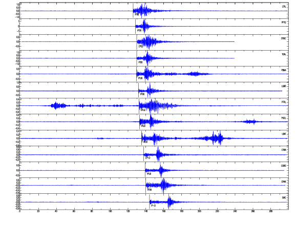 Mapa del epicentro: Los triángulos verdes son las estaciones acelerográficas usadas para calcular el epicentro que se muestra como un punto amarillo. El detalle de la magnitud y distancia a San José se muestra en el cuadro inserto en el mapa.