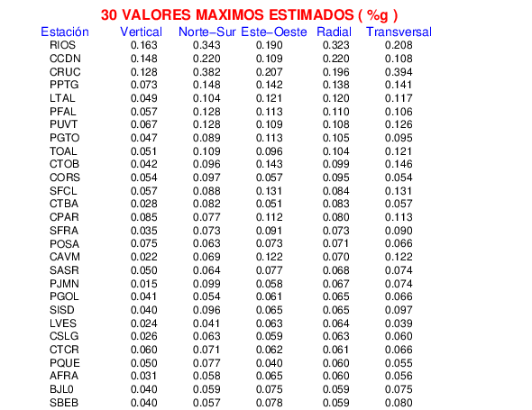 La siguiente tabla muestra los datos de aceleración máxima para cada componente en porcentaje de la aceleración de la gravedad (%g). Estos se obtienen dividiendo el valor del PGA registrado por 980 cm/s2 y multiplicándolo por 100. Los valores de las últimas dos columnas corresponden a la componente radial y transversal. Los datos se listan en orden descendente según el valor de la componente radial.