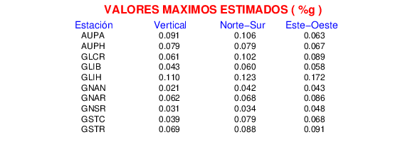 La siguiente tabla muestra los datos de aceleración máxima para cada componente en porcentaje de la aceleración de la gravedad (%g). Estos se obtienen dividiendo el valor del PGA registrado por 980 cm/s2 y multiplicándolo por 100.
