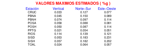 La siguiente tabla muestra los datos de aceleración máxima para cada componente en porcentaje de la aceleración de la gravedad (%g). Estos se obtienen dividiendo el valor del PGA registrado por 980 cm/s2 y multiplicándolo por 100.
