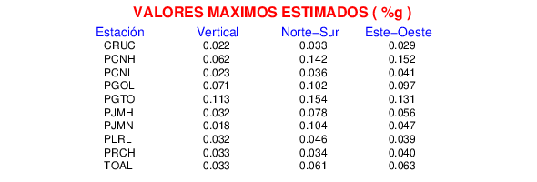 La siguiente tabla muestra los datos de aceleración máxima para cada componente en porcentaje de la aceleración de la gravedad (%g). Estos se obtienen dividiendo el valor del PGA registrado por 980 cm/s2 y multiplicándolo por 100.