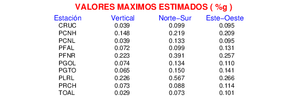 La siguiente tabla muestra los datos de aceleración máxima para cada componente en porcentaje de la aceleración de la gravedad (%g). Estos se obtienen dividiendo el valor del PGA registrado por 980 cm/s2 y multiplicándolo por 100.