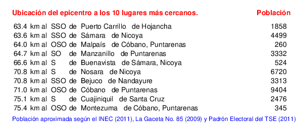 Mapa de la zona epicentral. Se muestran las poblaciones más cercanas al epicentro y fallas activas. Abajo están las distancias que hay del epicentro a cada uno de los diez sitios más cercanos y la cantidad de habitantes que poseen.