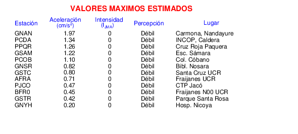 Intensidades en sitios de registro.Cada uno de los cuadrados en el mapa corresponde a la ubicación de un acelerógrafo al momento del sismo. Estos se muestran en distintos colores según la escala mostrada al pie de la figura.