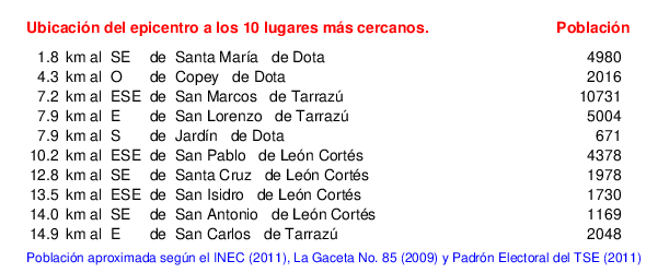 Mapa de la zona epicentral. Se muestran las poblaciones más cercanas al epicentro y fallas activas. Abajo están las distancias que hay del epicentro a cada uno de los diez sitios más cercanos y la cantidad de habitantes que poseen.