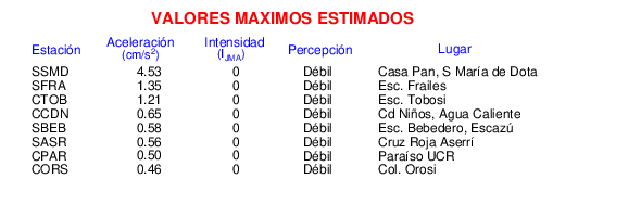 Intensidades en sitios de registro.Cada uno de los cuadrados en el mapa corresponde a la ubicación de un acelerógrafo al momento del sismo. Estos se muestran en distintos colores según la escala mostrada al pie de la figura.